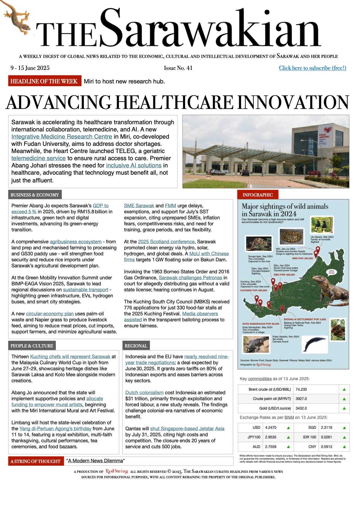 This week’s headline shines a light on the medical innovation that is happening, which, in addition to the three private hospitals opening in Kuching within the next 3 years, will raise the game for the medical industry in Sarawak. What is raising blood pressures, though, is the benchmark crude Brent oil price has jumped by more than 12% from a week ago due to Israel and Iran bombing each other. Locally, business associations are raising their voices against the sudden expansion of sales and services tax (SST). This week’s infographic looks at the numerous reported wildlife encounters all over Sarawak in 2024. Which encounter would raise your heartbeat? PS: My op-ed makes a debut in A String of Thought. Rebuttals welcome.