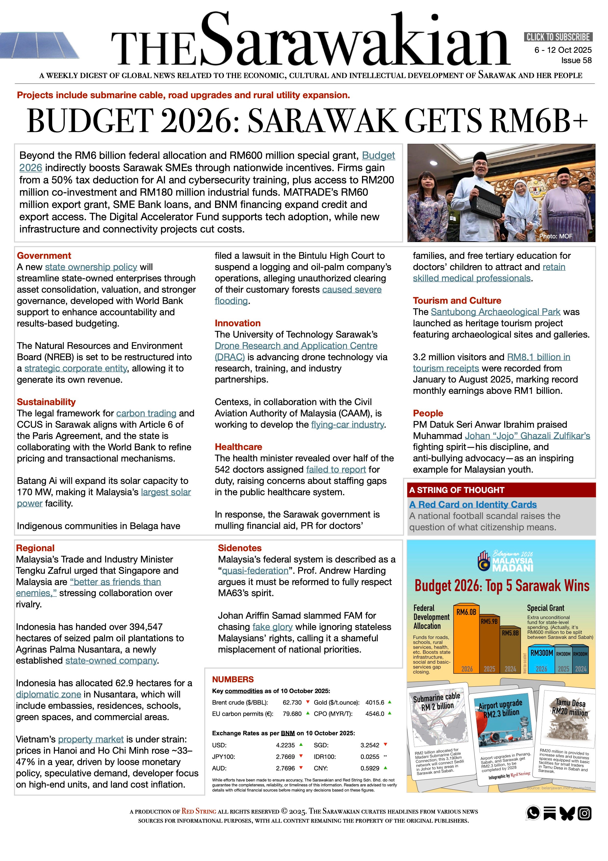The big news this week is, of course, the 2026 national budget. Sarawak gets a clean RM6 billion allocation, up slightly from last year’s RM5.9 billion. Unless you’ve been living under a rock, you’d have seen the many breakdowns, highlights, and analyses floating around. This week’s infographic points out the top five items most relevant to Sarawak.