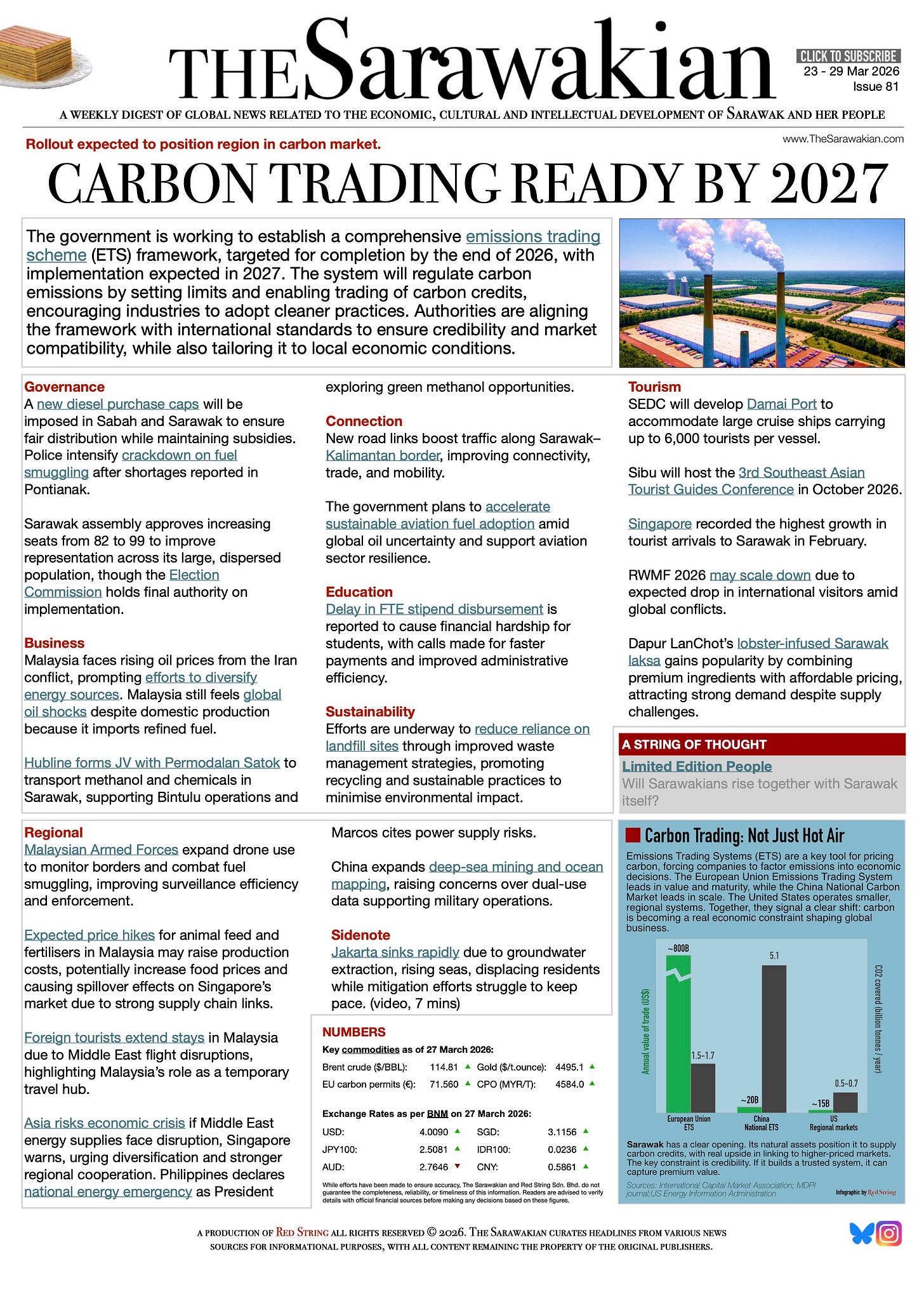 The infographic this week looks at some of the numbers from the major emissions trading schemes around the world. In case you have forgotten, the EU carbon permit price has been tracked on The Sarawakian for a while now (see NUMBERS). I await the day I can replace that number with a Sarawak-based figure, instead.