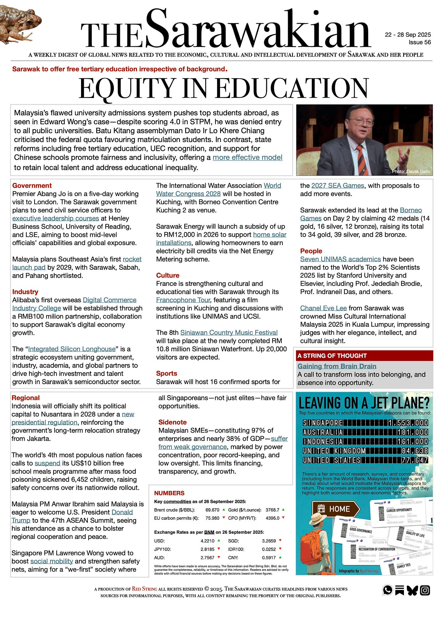 This week’s issue is about leadership: the Sarawak government is showing the way in how to build an equitable society through fair access to education for all. Abang Jo is in London to create opportunities for upskill our civil servants to the next level. In sports, the Sarawakian contingent is leading at the Borneo Games (concluding today).