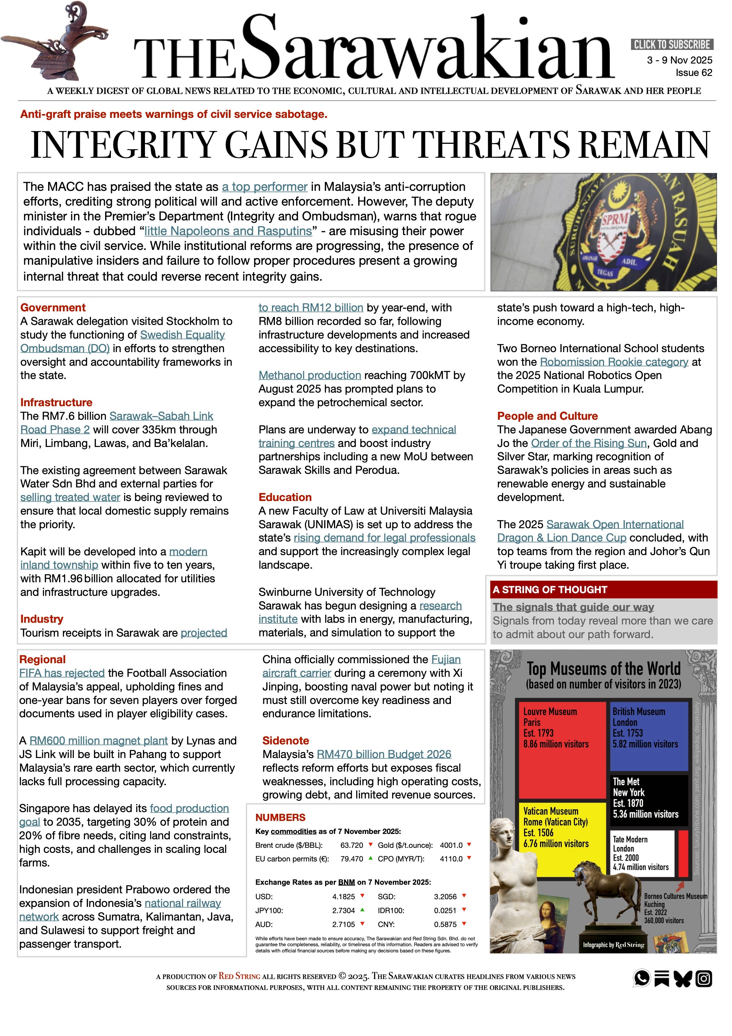 Speaking of good things, a headline that didn’t quite make it into this week’s issue deserves mention: the Borneo Cultures Museum outpacing the Louvre in an online popularity poll. I enjoy a good poll, but I like data even more. So the infographic this week compares visitor numbers of the world’s top five museums against our own Borneo Cultures Museum.